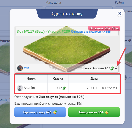 Также здесь Вы можете наблюдать за историей ставки по конкретному лоту, достаточно просто кликнуть на этот черный треугольник