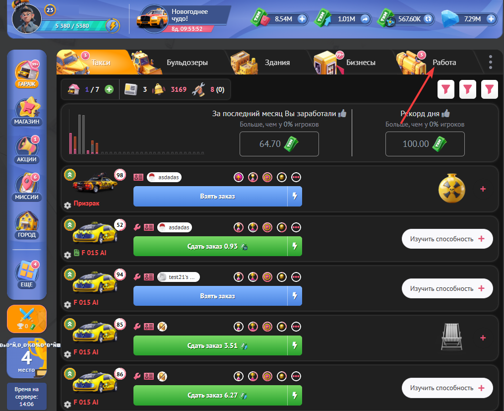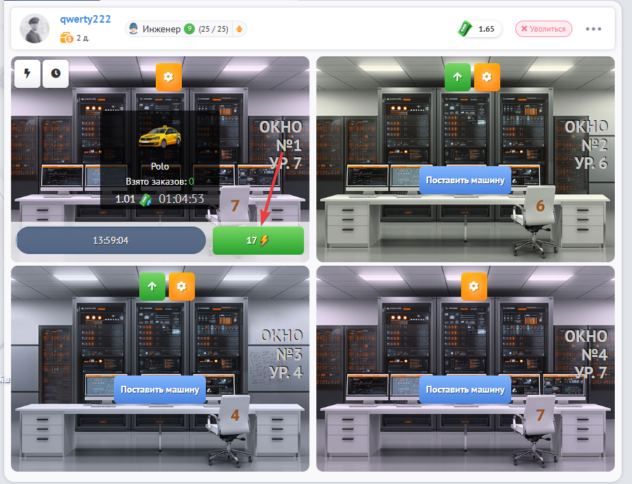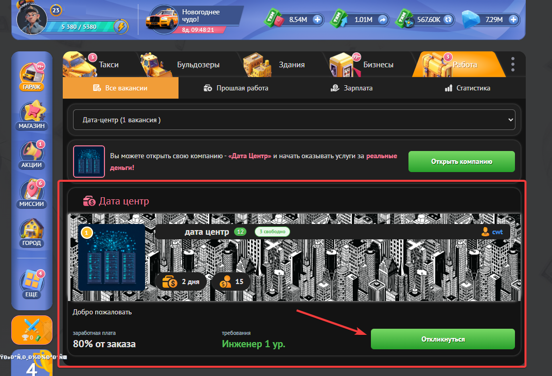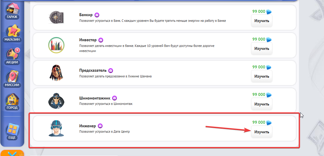 Также за работу в “Дата центре” Ваш навык “Инженер” будет автоматически улучшатся,что поможет Вам больше зарабатывать.