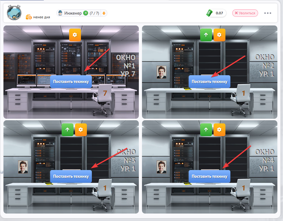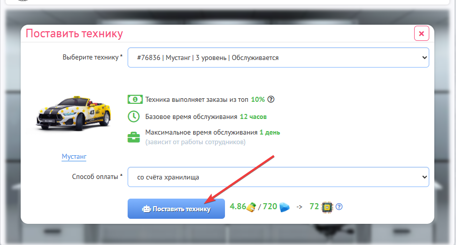Вы устанавливаете свою технику в свободное окно. Чтобы установить технику нужно кликнуть “Поставить машину”